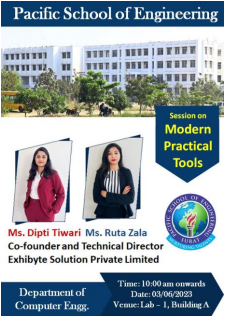 The Expert talk on “Modern Practical Tools” was taken by Ms. Dipti Tiwari and Ms. Ruta Zala for 4 th and 6th Semester CE students has participated with great enthusiasm throughout the day. It was a houseful day with more than 40 students participating with full energy and asking questions on Latest tool using in IT