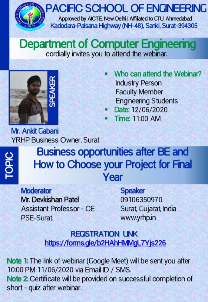 This session was carried out by Mr. Krunal Parvadia CEO Softices Technologies Surat. The Seminar session is started with flower welcome by Mehul Patel, HOD of CE department. Then after session was started at 11:15 a.m. He had started lecture by delivering basic information about industries and recent trends. Then after he has given some motivational lecture to motivate student about their career. Many of the students had asked various questions regarding lecture. After completion of seminar Prof. Abhijit Parmar delivered thanks to Mr. Krunal Parvadia to spare their valuable time for students.